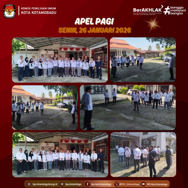 KPU KOTAMOBAGU – Komisi Pemilihan Umum (KPU) Kota Kotamobagu melaksanakan Apel Kerja Pagi, bertempat di halaman kantor, pada hari Senin, 26 Januari 2026. Kegiatan ini diikuti oleh Komisioner dan jajaran Sekretariat. Ketua KPU Kotamobagu, Mishart A. Manoppo, yang bertugas sebagai Pembina Apel, dalam arahannya mengajak seluruh jajaran untuk terus meningkatkan kinerja organisasi serta menegakkan disiplin dalam pelaksanaan tugas. “Saya meminta seluruh jajaran KPU Kotamobagu untuk terus memaksimalkan kinerja organisasi dengan bekerja secara profesional, menjaga soliditas, dan meningkatkan kedisiplinan dalam melaksanakan setiap tugas serta tanggung jawab sesuai ketentuan yang berlaku. Dengan semangat ini, kita dapat memastikan seluruh pekerjaan berjalan lancar dan memberikan hasil yang optimal” ujar Mishart. Dengan semangat yang ditanamkan oleh Ketua KPU Kotamobagu, apel pagi yang diikuti seluruh jajaran KPU Kotamobagu menjadi momentum untuk memperkuat disiplin, kerja sama, serta profesionalisme dalam menjalankan setiap tugas dan tanggung jawab. Penulis: Parhubmas dan SDM / Amar ....