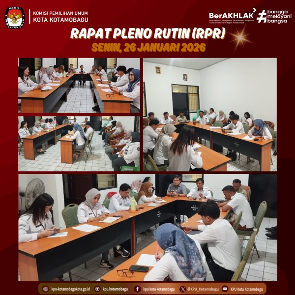 KPU KOTAMOBAGU – Komisi Pemilihan Umum (KPU) Kota Kotamobagu menggelar Rapat Pleno Rutin (RPR), bertempat di Ruang Rapat, pada hari Senin 26 Januari 2026. Kegiatan ini diikuti oleh seluruh jajaran Komisioner dan Sekretariat. Dalam RPR kali ini, dilakukan evaluasi terhadap kegiatan yang telah dilaksanakan pada minggu sebelumnya serta penyusunan rencana kerja ke depan. Ketua KPU Kotamobagu, Mishart A. Manoppo, dalam penyampaiannya mengapresiasi capaian yang diraih KPU Kotamobagu pada Penganugerahan Penghargaan KPU Kabupaten/Kota se-Sulawesi Utara, di mana KPU Kotamobagu berhasil meraih peringkat terbaik III dalam kategori Penyelenggaraan SPIP Terbaik Tahun 2025. “Saya mengapresiasi dan mengucapkan terima kasih kepada seluruh jajaran KPU Kotamobagu yang telah bekerja keras mengumpulkan dan melengkapi seluruh bukti dukung dalam pelaporan SPIP. Capaian ini merupakan hasil kerja bersama. Ke depan, saya berharap kita semua dapat terus bekerja lebih giat, meningkatkan kualitas kinerja, sehingga mampu meraih hasil yang lebih baik lagi” ujar Acim sapaan akrabnya. Rapat Pleno Rutin tersebut menjadi sarana evaluasi dan koordinasi bagi seluruh jajaran KPU Kotamobagu dalam memastikan setiap program dan kegiatan berjalan sesuai perencanaan. Melalui rapat ini, diharapkan kinerja organisasi semakin optimal serta mampu mendorong peningkatan kualitas tata kelola dan capaian KPU Kotamobagu ke depan. Penulis: Parhubmas dan SDM / Amar ....