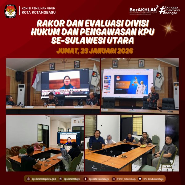 KPU KOTAMOBAGU – Tingkatkan layanan hukum dan pengawasan Komisi Pemilihan Umum (KPU) Kota Kotamobagu mengikuti Rapat Koordinasi dan Evaluasi Divisi Hukum dan Pengawasan. Kegiatan ini digelar oleh KPU Sulawesi Utara (Sulut) secara daring dan luring pada Jumat, 23 Januari 2026. Rapat koordinasi tersebut diikuti oleh Ketua, Anggota, Sekretaris, serta Kepala Subbagian Teknis dan Hukum KPU Kabupaten/Kota se-Sulut. Kegiatan dibuka oleh Ketua Divisi Hukum dan Pengawasan KPU RI, Iffa Rosita, dalam arahannya ia menekankan pentingnya membangun hubungan yang berkelanjutan antara penyelenggara pemilu, peserta pemilu, dan pemilih. “Tanggung jawab KPU tidak hanya terbatas pada pelaksanaan tahapan pemilu dan Pilkada, tetapi juga berlanjut pada masa pasca-tahapan. Saat ini, KPU tengah menggiatkan percepatan pembangunan Zona Integritas, sehingga hal tersebut perlu menjadi perhatian bersama” ujar Iffa. Sementara, Ketua KPU Sulut, Kenly Poluan, menekankan pentingnya peningkatan kualitas pelayanan informasi kepada publik, khususnya informasi hukum, yang disediakan melalui Jaringan Dokumentasi dan Informasi Hukum (JDIH), sebagai bagian dari upaya memperkuat keterbukaan dan akuntabilitas lembaga. Melalui rapat koordinasi ini, diharapkan KPU Kabupaten/Kota, termasuk KPU Kotamobagu, dapat semakin memperkuat tata kelola kelembagaan, meningkatkan kualitas pelayanan hukum dan pengawasan, serta mewujudkan penyelenggaraan pemilu yang profesional, transparan, dan berintegritas. Penulis: Tekhum / Orlando ....