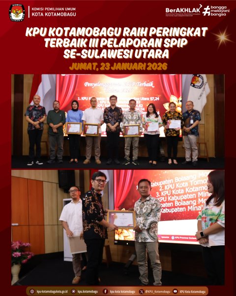 KPU KOTAMOBAGU – Komisi Pemilihan Umum (KPU) Kota Kotamobagu berhasil meraih peringkat terbaik III dalam kategori Penyelenggaraan Sistem Pengendalian Intern Pemerintah (SPIP) pada acara penganugerahan penghargaan bagi KPU kabupaten/kota se-Sulawesi Utara, yang digelar pada Jumat, 23 Januari 2026. Penghargaan tersebut menjadi bentuk pengakuan atas komitmen KPU Kotamobagu dalam menerapkan sistem pengendalian intern secara berkelanjutan, sebagai bagian dari upaya memperkuat tata kelola organisasi. Ketua KPU Provinsi Sulawesi Utara, Kenly Poluan, dalam sambutannya menyampaikan bahwa satuan kerja yang meraih penghargaan dapat dijadikan sebagai tolok ukur dan contoh bagi satuan kerja lainnya. Ia juga menekankan pentingnya pengelolaan kinerja satuan kerja yang terdokumentasi dengan baik dalam produk hukum sebagai bagian dari upaya memperkuat tata kelola kelembagaan. “Saya berharap penghargaan ini dapat menjadi dorongan bagi seluruh jajaran KPU Kabupaten/Kota untuk terus menyempurnakan manajemen organisasi dan meningkatkan kualitas layanan publik” ujar Kenly. Sementara, Ketua Divisi Hukum dan Pengawasan, Ilmi K. Paputungan, menyampaikan apresiasi kepada Sekretariat yang telah menyiapkan bukti dukung. “Terima kasih kepada Sekretariat atas peran dan kerja samanya dalam menyiapkan bukti dukung pelaporan SPIP, sehingga proses pelaporan dapat berjalan dengan baik dan menghasilkan capaian yang cukup memuaskan serta diharapkan dapat terus ditingkatkan ke depannya” ujar Ilmi. Capaian ini diharapkan menjadi langkah awal di tahun baru bagi KPU Kotamobagu untuk terus memperkuat kualitas kinerja satuan kerja yang selaras dengan instrumen SPIP, guna mewujudkan penyelenggaraan pemilu yang profesional, transparan, dan akuntabel. Penulis: Tekhum / Orlando ....