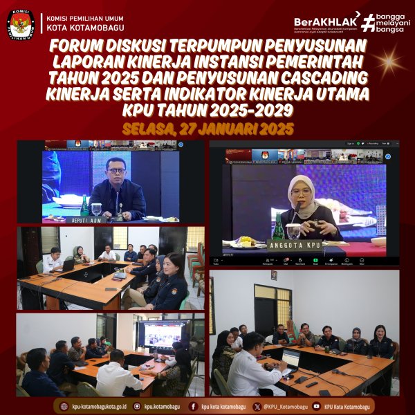 KPU KOTAMOBAGU - Komisi Pemilihan Umum (KPU) Kota Kotamobagu mengikuti Forum Diskusi Terpumpun (FDT) dalam rangka penyusunan Laporan Kinerja Instansi Pemerintah (LKjIP) serta sinkronisasi Cascading Kinerja dan Indikator Kinerja Utama (IKU) yang diselenggarakan KPU RI secara daring, Selasa 27 Januari 2026. Rapat tersebut diikuti oleh Ketua, Anggota, Sekretaris dan Kepala Subbagian KPU Kotamobagu. Fokus utama dalam diskusi ini adalah pemantapan Cascading Kinerja. Melalui proses ini, visi dan misi besar KPU diturunkan secara sistematis menjadi target-target kerja yang lebih spesifik bagi setiap unit di bawahnya. Hal ini bertujuan agar tidak ada program yang tumpang tindih dan setiap personel memahami kontribusi nyatanya terhadap organisasi. Melalui penguatan IKU dan laporan kinerja yang berkualitas, KPU menargetkan peningkatan predikat Sistem Akuntabilitas Kinerja Instansi Pemerintah (SAKIP) yang diberikan oleh Kemenpan-RB. Peningkatan ini akan menjadi bukti bahwa KPU terus bertransformasi menjadi lembaga penyelenggara Pemilu yang semakin profesional dan akuntabel. Hal serupa ditegaskan oleh Ketua Divisi Hukum dan Pengawasan KPU RI, Iffa Rosita. Saat menutup acara beliau menyampaikan semua kegiatan yang kita lakukan saling berkorelasi, saling berkaitan dan saling mempengaruhi keseluruhan. “Kegiatan ini merupakan tahap akhir dari suatu perencanaan. Prosesnya diawali dengan penyusunan rencana, kemudian dilanjutkan dengan pengorganisasian sebelum pelaksanaan dilakukan” ujar Iffa. Semangat partisipasi dalam FDT ini mencerminkan tekad KPU Kotamobagu untuk menyelaraskan setiap indikator kinerja dengan standar akuntabilitas nasional. Sinergi ini diharapkan mampu mendorong performa lembaga yang lebih mandiri dan profesional dalam mengawal demokrasi. Penulis: Rendatin / Edo ....