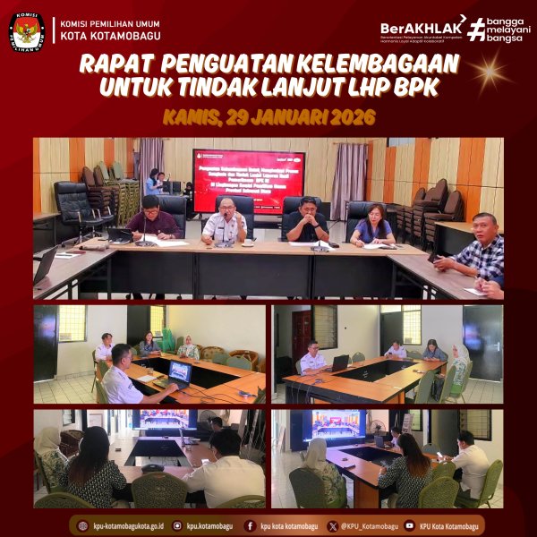 KPU KOTAMOBAGU – Komisi Pemilihan Umum (KPU) Kota Kotamobagu mengikuti Rapat Penguatan Kelembagaan dan Tindak Lanjut Laporan Hasil Pemeriksaan Badan Pemeriksa Keuangan (BPK) bersama KPU Provinsi Sulawesi Utara (Sulut). Kegiatan ini dilaksanakan secara daring melalui aplikasi Zoom Meeting pada Kamis, 29 Januari 2026, dan diikuti oleh Sekretaris, Kepala Bagian, serta Kepala Subbagian KPU se-Sulawesi Utara. Rapat tersebut bertujuan untuk meningkatkan kesiapan kelembagaan KPU Sulut, baik dari aspek teknis, hukum, maupun pengelolaan anggaran. Kegiatan rapat dibuka oleh Sekretaris KPU Sulut, Meidy R. Malonda. Dalam sambutannya, beliau menyampaikan pentingnya penyusunan dan pengelolaan anggaran yang rasional, terukur, serta sesuai dengan ketentuan peraturan perundang-undangan, khususnya dalam menghadapi dinamika pasca tahapan pemilu. “Penyusunan dan pengelolaan anggaran harus dilakukan secara rasional, terukur, dan berpedoman pada ketentuan peraturan perundang-undangan yang berlaku. Hal ini menjadi sangat penting, terutama dalam menghadapi berbagai dinamika pasca tahapan pemilu, agar seluruh program dan kegiatan kelembagaan dapat berjalan efektif dan akuntabel,” ujar Meidy. Sementara itu, Kepala Bagian Keuangan, Umum, dan Logistik KPU Provinsi Sulawesi Utara, Ariesto J. Matantu, menyampaikan kesiapan penyusunan laporan pertanggungjawaban anggaran, termasuk tindak lanjut atas rekomendasi Laporan Hasil Pemeriksaan (LHP) BPK RI, guna memastikan pengelolaan keuangan KPU semakin akuntabel dan transparan. Melalui kegiatan ini, diharapkan KPU Kotamobagu dapat semakin memperkuat kesiapan kelembagaan, meningkatkan koordinasi lintas satuan kerja, serta memastikan seluruh proses administrasi, teknis, dan keuangan berjalan sesuai ketentuan yang berlaku. Penulis: KUL / Erick ....