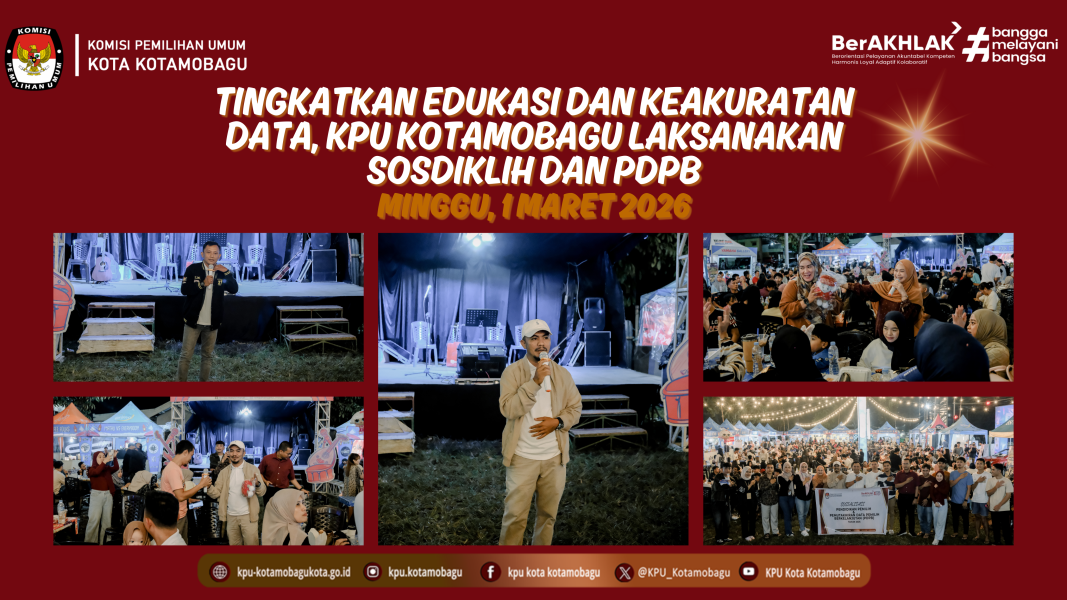 KPU KOTAMOBAGU – Tingkatkan edukasi dan keakuratan data, Komisi Pemilihan Umum (KPU) Kota Kotamobagu melaksanakan Sosialisasi Pendidikan Pemilih (Sosdiklih) dan Pemutakhiran Data Pemilih Berkelanjutan (PDPB) Tahun 2026 pada Minggu, 1 Maret 2026, bertempat di Ramadhan Camp Matali. Kegiatan ini merupakan kolaborasi antara Divisi Sosialisasi, Pendidikan Pemilih, Partisipasi Masyarakat, dan Sumber Daya Manusia (Sosdiklih Parmas dan SDM) bersama Divisi Perencanaan, Data, dan Informasi (Rendatin). Ketua Divisi Hukum dan Pengawasan, Ilmi K. Paputungan, dalam arahannya saat membuka kegiatan, menyampaikan apresiasi kepada panitia atas kesempatan yang diberikan kepada KPU Kotamobagu untuk melaksanakan sosialisasi tersebut. “Kami mengucapkan terima kasih kepada panitia yang telah memberikan kesempatan kepada KPU Kotamobagu untuk melaksanakan sosialisasi ini. Kami berharap materi yang disampaikan dapat diperhatikan dengan baik oleh para pengunjung Ramadan Camp Matali sehingga memberikan wawasan baru terkait kepemiluan,” ujarnya. Sementara itu, Ketua Divisi Sosialisasi, Pendidikan Pemilih, Partisipasi Masyarakat, dan SDM, Hairun Laode, mengajak masyarakat untuk menjadi pemilih yang cerdas, rasional, dan bertanggung jawab dalam menentukan pilihan politiknya. “Sebagai pemilih, kita harus memahami bahwa suara kita sangat menentukan arah pembangunan dan masa depan daerah. Karena itu, pilihlah pemimpin atau wakil rakyat dengan sebijak-bijaknya, berdasarkan visi, misi, serta rekam jejak yang jelas. Jangan mudah terpengaruh oleh politik uang, janji-janji sesaat, maupun black campaign yang dapat merusak kualitas demokrasi kita. Kita juga harus bijak dalam menerima dan menyebarkan informasi, memastikan kebenarannya terlebih dahulu agar tidak ikut menyebarkan hoaks atau informasi yang menyesatkan,” tegas Hairun. Hairun juga menyampaikan bahwa Indeks Partisipasi Pemilu dan Pilkada Kotamobagu pada tahun 2024 mengalami peningkatan. Menurutnya, capaian tersebut menjadi motivasi bagi KPU Kotamobagu untuk terus meningkatkan edukasi politik kepada masyarakat. “Sosialisasi ini merupakan sarana kami untuk terus mencerdaskan masyarakat tentang demokrasi dan meningkatkan indeks partisipasi tersebut,” tambahnya. Diketahui, Ketua Divisi Perencanaan, Data, dan Informasi, Heriyana Amir, juga turut menyampaikan materi terkait PDPB dalam kesempatan tersebut. Melalui kegiatan ini, KPU Kotamobagu berharap masyarakat semakin memahami pentingnya peran sebagai pemilih dalam demokrasi, sekaligus turut berpartisipasi aktif dalam proses pemutakhiran data pemilih guna mewujudkan pemilu yang berkualitas dan berintegritas. Penulis: Parhubmas dan SDM / Amar ....