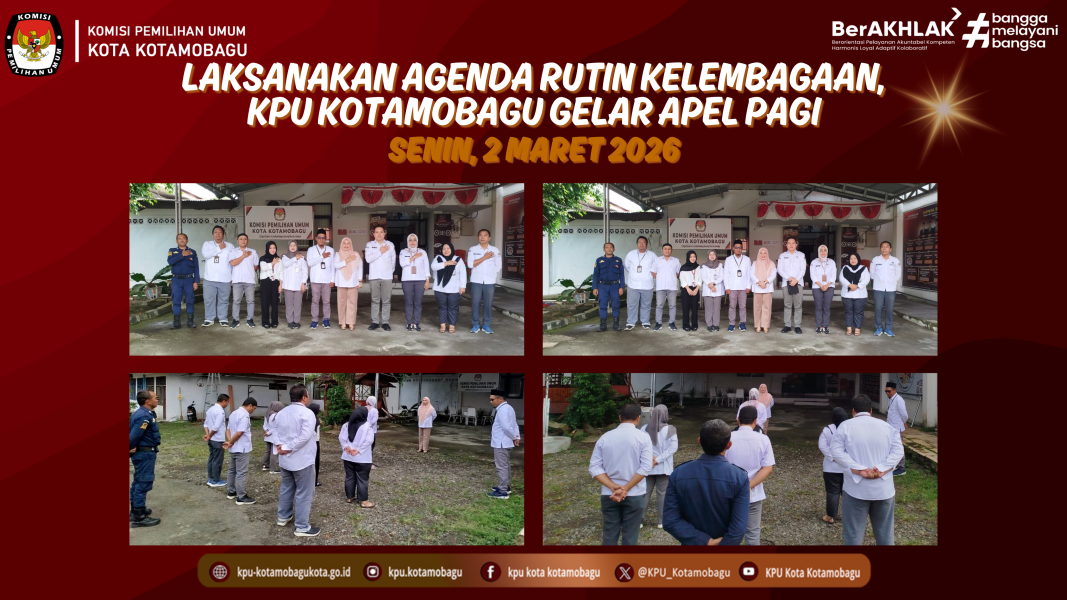 KPU KOTAMOBAGU – Komisi Pemilihan Umum (KPU) Kota Kotamobagu menggelar Apel Pagi yang dilaksanakan di halaman kantor pada Senin, 2 Maret 2026. Apel tersebut diikuti oleh Komisioner serta jajaran sekretariat sebagai bagian dari agenda rutin kelembagaan. Bertindak sebagai Pembina Apel, Ketua Divisi Perencanaan, Data, dan Informasi (Rendatin), Heriyana Amir, menyampaikan sejumlah arahan penting terkait pelaksanaan tugas dan tanggung jawab kelembagaan. Dalam amanatnya, ia menyampaikan kegiatan sosialisasi yang sebelumnya telah dilaksanakan serta pentingnya menjaga kedisiplinan pegawai dalam menunjang kinerja organisasi. “Kegiatan sosialisasi yang telah kita laksanakan merupakan bentuk tanggung jawab kita dalam memberikan pemahaman kepada masyarakat terkait kepemiluan. Evaluasi perlu terus dilakukan agar pelaksanaan kegiatan berikutnya dapat berjalan lebih baik dan maksimal,” ujar Yana sapaan akrabnya. Selain itu, ia juga menekankan pentingnya disiplin sebagai fondasi utama dalam mendukung profesionalisme kerja di lingkungan KPU Kotamobagu. Menurutnya, kedisiplinan bukan hanya soal kehadiran, tetapi juga menyangkut integritas, tanggung jawab, dan komitmen terhadap tugas. Ia mengingatkan seluruh jajaran agar tetap menjaga semangat kerja, meningkatkan koordinasi, serta mematuhi aturan yang berlaku demi terciptanya tata kelola kelembagaan yang baik dan akuntabel. Melalui Apel Pagi tersebut, KPU Kotamobagu berharap seluruh jajaran dapat terus meningkatkan kinerja, menjaga soliditas, serta memperkuat komitmen dalam menjalankan tugas-tugas kepemiluan secara profesional dan berintegritas. Penulis: Parhubmas dan SDM / Amar ....