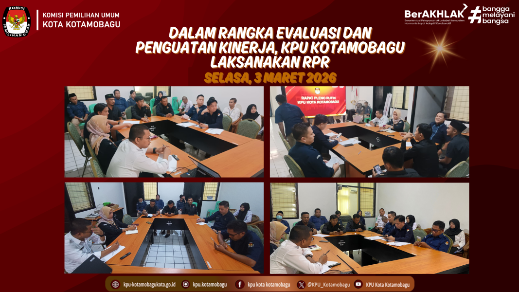 KPU KOTAMOBAGU - Komisi Pemilihan Umum (KPU) Kota Kotamobagu melaksanakan Rapat Pleno Rutin (RPR) bertempat di ruang rapat, pada hari Selasa, 3 Maret 2026. RPR merupakan bagian dari agenda rutin dalam rangka evaluasi serta penguatan kinerja kelembagaan. Rapat ini diikuti oleh komisioner dan jajaran sekretariat. Dalam rapat pleno tersebut, berbagai hal dibahas, mulai dari evaluasi pelaksanaan program kerja, administrasi perkantoran, hingga peningkatan kapasitas sumber daya manusia di lingkungan KPU Kotamobagu. Ketua KPU Kotamobagu, Mishart Manoppo, dalam arahannya menekankan pentingnya menjaga kedisiplinan kerja, terlebih di bulan suci Ramadan. Ia mengingatkan bahwa ibadah puasa tidak boleh menjadi alasan untuk menurunkan kualitas pelayanan dan tanggung jawab sebagai penyelenggara pemilu. “Kita tetap harus menjaga kedisiplinan dan profesionalitas dalam bekerja, walaupun sedang menjalankan ibadah puasa. Justru ini menjadi momentum untuk meningkatkan integritas dan tanggung jawab kita sebagai pelayan publik,” ujar Mishart. Selain itu, Ia juga memberikan perhatian khusus kepada para Calon Pegawai Negeri Sipil (CPNS) dan meminta agar para CPNS lebih proaktif dalam mempelajari serta memahami tata naskah dinas yang berlaku di lingkungan KPU. Ia menegaskan bahwa pemahaman terhadap tata naskah dinas sangat penting guna menunjang tertib administrasi dan kelancaran tugas-tugas kelembagaan. Menurutnya, setiap staf, khususnya CPNS, harus mampu memahami format, mekanisme, serta prosedur surat-menyurat secara benar agar tidak terjadi kesalahan administratif. Secara tidak langsung, Mishart menyampaikan bahwa peningkatan kapasitas dan kedisiplinan merupakan bagian dari komitmen bersama untuk menjaga profesionalitas lembaga. Ia berharap seluruh jajaran dapat terus belajar, beradaptasi, dan bekerja sesuai dengan regulasi yang berlaku. Rapat pleno rutin ini diharapkan dapat memperkuat koordinasi internal serta meningkatkan kualitas kinerja KPU Kotamobagu dalam menjalankan tugas dan fungsinya sebagai penyelenggara pemilu di daerah. Penulis: Parhubmas dan SDM / Amar ....