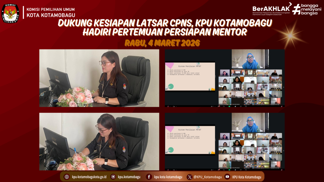 KPU KOTAMOBAGU – Komisi Pemilihan Umum (KPU) Kota Kotamobagu menghadiri undangan Pertemuan Persiapan Mentor Latsar CPNS KPU Tahun 2026 secara daring melalui Zoom Meeting pada Rabu, 4 Maret 2026. Kegiatan ini diikuti dalam rangka mendukung kesiapan pelaksanaan Pelatihan Dasar (Latsar) CPNS di lingkungan KPU Provinsi Sulawesi Utara dan Gorontalo yang bekerja sama dengan Balai Diklat Keagamaan (BDK) Manado. Dalam pertemuan tersebut, Sulistiawati Paita, selaku coach dari BDK Manado menyampaikan berbagai hal strategis terkait peran dan tanggung jawab mentor dalam pendampingan peserta Latsar. Ia menegaskan bahwa mentor memiliki fungsi yang sangat krusial, tidak hanya sebagai pembimbing administratif, tetapi juga sebagai teladan nyata dalam penerapan nilai-nilai BerAKHLAK, etika kerja, serta budaya organisasi di satuan kerja masing-masing. “Mentor bukan sekadar pendamping administratif. Kita adalah cermin bagi para CPNS. Mereka belajar bukan hanya dari arahan kita, tetapi juga dari bagaimana kita bersikap, bekerja, dan menerapkan nilai-nilai ASN dalam keseharian. Karena itu, kesiapan dan kesungguhan kita sebagai mentor sangat menentukan kualitas aktualisasi peserta Latsar,” ujar Sulistiawati. Ia juga menyampaikan harapannya agar para mentor dapat menjalankan tugas pendampingan secara optimal. Ia menyebutkan bahwa keberhasilan Latsar CPNS sangat bergantung pada sejauh mana mentor mampu mendorong peserta untuk tidak hanya memahami materi pelatihan secara teori, tetapi juga mengaktualisasikannya secara nyata di tempat kerja sebagai upaya memperkuat kompetensi, integritas, dan profesionalisme CPNS di lingkungan KPU. Melalui rapat koordinasi ini, KPU Kota Kotamobagu bersama seluruh satuan kerja KPU se-Sulawesi Utara dan Gorontalo diharapkan semakin memahami peran strategis mentor dalam Latsar CPNS KPU Tahun 2026. Penulis: Parhubmas dan SDM / Amar ....