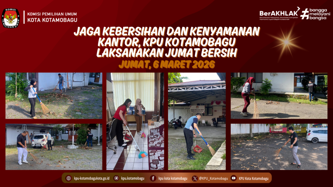 KPU KOTAMOBAGU – Komisi Pemilihan Umum (KPU) Kota Kotamobagu melaksanakan kegiatan Jumat Bersih pada Jumat, 6 Maret 2026. Kegiatan yang melibatkan seluruh staf sekretariat ini berlangsung di dalam dan sekitar lingkungan Kantor KPU Kotamobagu sejak pagi hari. Jumat Bersih merupakan program rutin yang dijalankan sebagai wujud komitmen lembaga dalam menjaga kebersihan, kerapian, dan kenyamanan lingkungan kerja. Kepala Sub Bagian Partisipasi, Hubungan Masyarakat, dan SDM KPU Kotamobagu, Yessi Z.S. Mentang, menyatakan bahwa kegiatan Jumat Bersih bukan sekadar rutinitas pembersihan fisik semata. Ia menegaskan bahwa kegiatan ini merupakan bagian dari upaya membangun budaya kerja yang sehat dan disiplin di lingkungan sekretariat. " Jumat Bersih ini bukan hanya soal membersihkan ruangan. Ini adalah bagian dari cara kita membangun kebiasaan baik bersama. Ketika tempat kerja kita bersih dan nyaman, semangat kita dalam melayani dan bekerja pun ikut meningkat. Saya berharap ini menjadi kegiatan yang kita jaga terus bersama-sama,” ujar Yessi di sela-sela kegiatan. Kegiatan Jumat Bersih KPU Kotamobagu berlangsung hingga menjelang siang hari dan seluruh staf yang terlibat berharap program ini dapat terus dipertahankan secara konsisten sebagai bagian dari budaya kerja positif di lingkungan KPU Kota Kotamobagu. Penulis: Parhubmas dan SDM / Amar ....