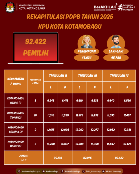 #HaloTemanPemilih berikut kami sampaikan Rekapitulasi Pemutakhiran Data Pemilih Berkelanjutan (PDPB) Tahun 2025 Kota Kotamobagu. Mengenai Surat Keputusan silakan untuk mengakses melalui link dibawah ini: 1. KEPUTUSAN KOMISI PEMILIHAN UMUM KOTA KOTAMOBAGU NOMOR 6 TAHUN 2025 TENTANG PENETAPAN REKAPITULASI PEMUTAKHIRAN DATA PEMILIH BERKELANJUTAN KOTA KOTAMOBAGU PROVINSI SULAWESI UTARA TRIWULAN KEDUA TAHUN 2025 2. KEPUTUSAN KOMISI PEMILIHAN UMUM KOTA KOTAMOBAGU NOMOR 8 TAHUN 2025 TENTANG PENETAPAN REKAPITULASI PEMUTAKHIRAN DATA PEMILIH BERKELANJUTAN KOTA KOTAMOBAGU PROVINSI SULAWESI UTARA TRIWULAN KETIGA TAHUN 2025 3. KEPUTUSAN KOMISI PEMILIHAN UMUM KOTA KOTAMOBAGU NOMOR 12 TAHUN 2025 TENTANG PENETAPAN REKAPITULASI PEMUTAKHIRAN DATA PEMILIH BERKELANJUTAN KOTA KOTAMOBAGU PROVINSI SULAWESI UTARA TRIWULAN KEEMPAT TAHUN 2025 ....
