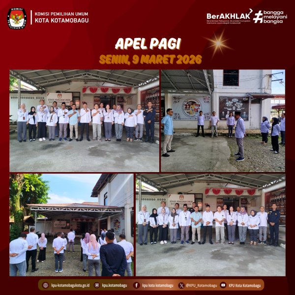 KPU KOTAMOBAGU – Perkuat semangat kerja, Komisi Pemilihan Umum (KPU) Kota Kotamobagu menggelar Apel Pagi bertempat di halaman kantor, pada Senin, 9 Maret 2026. Kegiatan rutin mingguan ini dihadiri oleh komisioner dan jajaran sekretariat. Ketua Divisi Hukum dan Pengawasan, Ilmi K. Paputungan, yang bertugas sebagai pembina apel, dalam arahannya mengingatkan pentingnya mempertahankan kedisiplinan dan etos kerja yang tinggi meskipun tengah menjalankan ibadah puasa Ramadan. “Ramadan adalah bulan penuh berkah yang justru harus menjadi pendorong semangat kita dalam bekerja. Berpuasa bukan halangan untuk tetap produktif dan profesional. Justru di sinilah kita diuji, apakah kita mampu menjaga integritas dan kualitas kerja kita di tengah keterbatasan. Kedisiplinan adalah cerminan karakter kita sebagai abdi negara yang amanah,” ujar Ilmi. Ia menambahkan bahwa kita tetap harus hadir tepat waktu, menyelesaikan tugas dengan penuh tanggung jawab, dan menjaga sikap profesional dalam melayani masyarakat, sebagaimana yang menjadi tugas pokok dan fungsi lembaga penyelenggara pemilu ini. Apel pagi diakhiri dengan doa bersama. Suasana apel berlangsung tertib, khusyuk, dan penuh semangat, mencerminkan komitmen seluruh insan KPU Kota Kotamobagu untuk terus memberikan yang terbaik dalam mengemban amanah sebagai penyelenggara pemilihan umum. Penulis: Parhubmas dan SDM / Amar ....