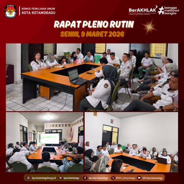 KPU KOTAMOBAGU – Jalin koordinasi internal, Komisi Pemilihan Umum (KPU) Kota Kotamobagu menggelar rapat pleno rutin (RPR) pada Senin, 9 Maret 2026, bertempat di ruang rapat. Kegiatan ini dihadiri oleh seluruh komisioner dan staf sekretariat yang membahas evaluasi pelaksanaan program kerja serta langkah-langkah yang perlu dituntaskan menjelang periode cuti bersama dan libur Hari Raya Idul Fitri. Dalam arahannya, Ketua KPU Kotamobagu, Mishart A. Manoppo, menekankan pentingnya memaksimalkan penyelesaian seluruh program kerja yang masih berjalan. Ia menegaskan hal tersebut langsung kepada segenap jajaran yang hadir. “Kita harus memaksimalkan kegiatan-kegiatan yang belum terselesaikan sebelum memasuki cuti bersama dan libur Hari Raya. Jangan sampai ada pekerjaan yang tertunda dan menumpuk ketika kita kembali bertugas,” ujar Mishart dalam rapat tersebut. Mishart juga menyampaikan bahwa setiap divisi diharapkan segera melakukan inventarisasi terhadap kegiatan-kegiatan yang masih dalam proses, agar penanganannya dapat diprioritaskan dalam hari-hari kerja yang tersisa. Ia menegaskan bahwa koordinasi antarjajaran menjadi kunci agar seluruh program dapat dirampungkan tepat waktu sebelum masa libur berlangsung. Selain membahas agenda kerja, rapat pleno tersebut juga merancang kegiatan buka puasa bersama yang direncanakan akan dilaksanakan pada Rabu, 11 Maret 2026. Kegiatan ini diharapkan dapat mempererat silaturahmi di antara seluruh komisioner dan pegawai KPU Kota Kotamobagu di tengah suasana Ramadan. Rapat pleno rutin ini menjadi salah satu forum penting bagi KPU Kota Kotamobagu dalam memastikan kelancaran pelaksanaan tugas dan fungsi kelembagaan, sekaligus menjaga semangat kebersamaan menjelang momen hari raya. Seluruh peserta rapat menyambut baik arahan ketua dan berkomitmen untuk menyelesaikan seluruh tanggung jawab yang ada sesuai jadwal. Penulis: Parhubmas dan SDM / Amar ....