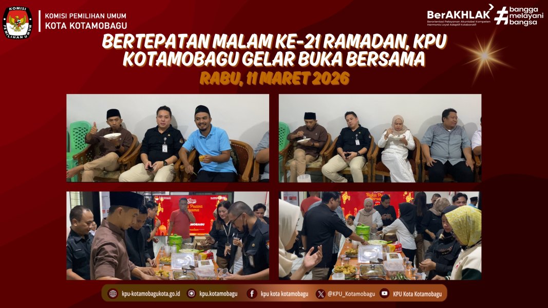 KPU KOTAMOBAGU - Bertepatan dengan malam ke-21 bulan suci Ramadan 1447 H, Komisi Pemilihan Umum (KPU) Kota Kotamobagu menggelar kegiatan buka puasa bersama pada Rabu, 11 Maret 2026. Kegiatan yang diikuti oleh komisioner dan jajaran sekretariat KPU Kota Kotamobagu tersebut berlangsung hangat dan penuh keakraban, sekaligus menjadi wujud nyata mempererat tali silaturahmi di lingkungan internal lembaga. Ketua KPU Kotamobagu, Mishart A. Manoppo, menyampaikan rasa syukurnya atas terselenggaranya kegiatan ini dan berharap momentum Ramadan mampu membawa semangat kerja yang lebih baik bagi seluruh insan KPU. “Momen buka puasa bersama ini bukan sekadar kegiatan seremonial. Ini adalah kesempatan kita untuk saling menguatkan, mempererat persaudaraan, dan menyatukan hati agar kita bisa bekerja lebih solid dalam menjalankan tugas-tugas kelembagaan ke depan,” ungkap Mishart. Mishart juga mengingatkan seluruh jajaran agar menjadikan bulan Ramadan sebagai sarana introspeksi dan peningkatan kinerja, sehingga setelah libur Hari Raya, seluruh program kerja yang telah direncanakan dapat kembali dilaksanakan dengan semangat yang lebih tinggi dan penuh tanggung jawab. Senada dengan itu, Sekretaris KPU Kotamobagu, Rifton A.J. Tulangow, turut mengapresiasi kegiatan buka puasa bersama ini dan menekankan pentingnya kebersamaan sebagai pondasi dalam pelayanan publik. “Kegiatan seperti ini sangat penting untuk menjaga kekompakan kita sebagai satu tim. Ketika kita solid di dalam, pelayanan kita kepada masyarakat pun akan semakin baik,” tutur Rifton. Seluruh pegawai menyambut antusias kegiatan tersebut sebagai bagian dari upaya menjaga harmoni dan kebersamaan di lingkungan KPU Kotamobagu, khususnya di bulan yang penuh berkah ini. Penulis: Parhubmas dan SDM / Amar ....