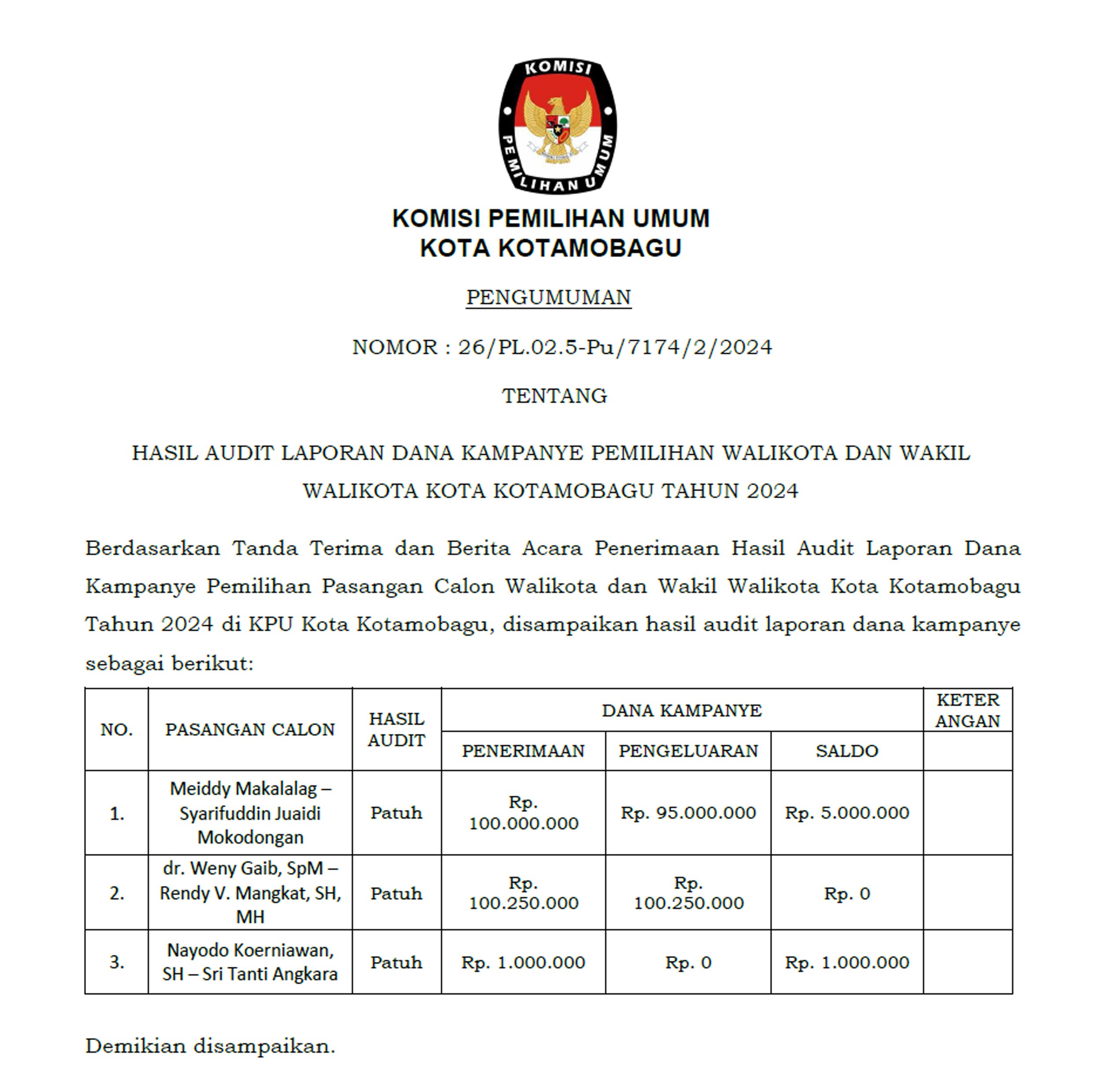 Berdasarkan Tanda Terima dan Berita Acara Penerimaan Hasil Audit Laporan Dana Kampanye Pemilihan Pasangan Calon Walikota dan Wakil Walikota Kota Kotamobagu Tahun 2024 di KPU Kota Kotamobagu, disampaikan hasil audit laporan dana kampanye di link di bawah ini