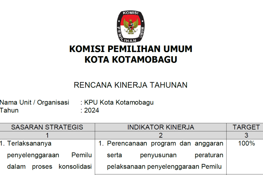 RENCANA KINERJA TAHUNAN KPU KOTAMOBAGU Selasa, 13 Februari 2024 00:00 25 RENCANA KINERJA TAHUNAN KPU KOTAMOBAGU TAHUN 2024 (RKT.2024) Baca Selengkapnya