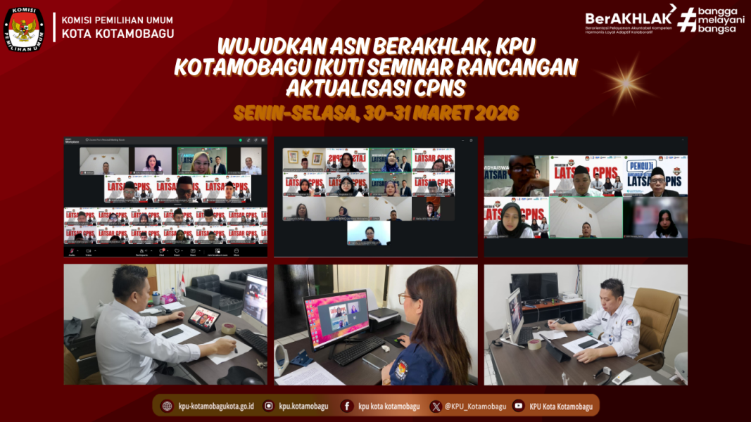 KPU KOTAMOBAGU – Wujudkan ASN BerAKHLAK, Komisi Pemilihan Umum (KPU) Kota Kotamobagu mengikuti kegiatan Seminar Rancangan Aktualisasi Calon Pegawai Negeri Sipil (CPNS) KPU se-Provinsi Sulawesi Utara pada Senin–Selasa, 30–31 Maret 2026. Kegiatan yang diselenggarakan atas kerja sama KPU Provinsi Sulawesi Utara dengan Balai Diklat Keagamaan Manado ini dilaksanakan melalui Zoom Meeting dan diikuti oleh seluruh KPU Kabupaten/Kota se-Sulawesi Utara.