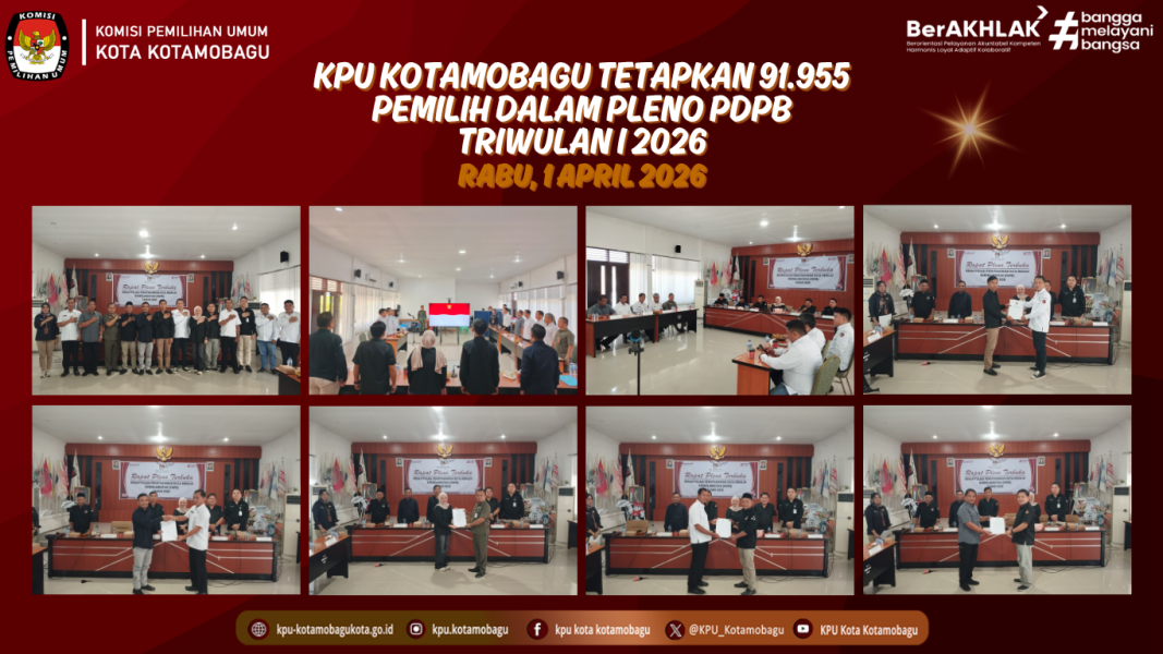 KPU KOTAMOBAGU – Komisi Pemilihan Umum (KPU) Kota Kotamobagu menetapkan jumlah pemilih berkelanjutan sebanyak 91.955 pemilih dalam Rapat Pleno Terbuka Pemutakhiran Data Pemilih Berkelanjutan (PDPB) Triwulan I Tahun 2026. Kegiatan tersebut dilaksanakan di Aula Kantor KPU Kotamobagu pada Rabu 1 April 2026 .