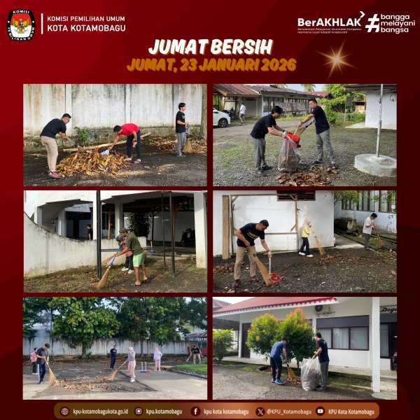 KPU KOTAMOBAGU – Komisi Pemilihan Umum (KPU) Kota Kotamobagu melaksanakan kegiatan Jumat Bersih di halaman dan ruangan kantor pada Jumat, 23 Januari 2026. Kegiatan Jumat Bersih ini diikuti oleh Komisioner serta jajaran Sekretariat KPU Kotamobagu. Kegiatan tersebut dilakukan sebagai bentuk kepedulian terhadap kebersihan dan kenyamanan lingkungan kerja. Seluruh pegawai secara bersama-sama membersihkan halaman kantor, ruang kerja, serta fasilitas pendukung lainnya. Kepala Subbagian Partisipasi, Hubungan Masyarakat, dan Sumber Daya Manusia, Yessi Z.S. Mentang, menyatakan bahwa melalui kegiatan Jumat Bersih, tercermin semangat kebersamaan dalam menjaga kebersihan dan kenyamanan lingkungan kerja. “Kegiatan Jumat Bersih merupakan wujud kepedulian bersama terhadap lingkungan kerja. Melalui kebersamaan dan gotong royong, kita tidak hanya menciptakan kantor yang bersih dan rapi, tetapi juga menumbuhkan rasa tanggung jawab, disiplin, serta kenyamanan dalam bekerja” ujar Yessi. Dengan adanya kegiatan ini, diharapkan lingkungan kantor KPU Kota Kotamobagu tetap terjaga kebersihannya sehingga dapat menciptakan suasana kerja yang sehat, nyaman, dan kondusif dalam menunjang pelaksanaan tugas dan pelayanan kepada masyarakat. Penulis: Parhubmas dan SDM / Amar