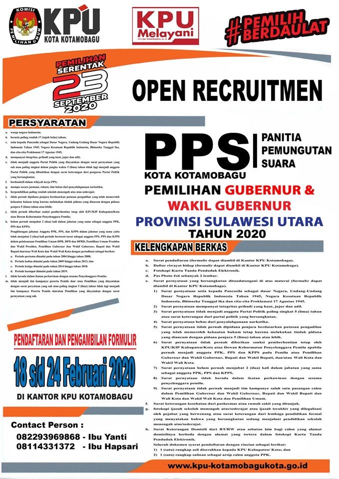 KOTAMOBAGU – Setelah melalui proses dan berbagai tahapan seleksi, akhirnya KPU Kota Kotamobagu menetapkan dan mengumumkan nama-nama Panitia Pemilihan Kecamatan (PPK) Pilgub Sulut Tahun 2020 terpilih. “Mereka-mereka yang terpilih dan ditetapkan adalah putra-putri terbaik Kota Kotamobagu. Jadi tidak ada istilah tidak baik, semuanya baik dan bagus-bagus,” kata Iwan Manoppo, Ketua KPU Kota Kotamobagu, Sabtu (15/02/2020). Setelah ditetapkan, lanjut Iwan, yang didampingi para komisioner KPU Kota Kotamobagu: Asep Sabar, Zulkifli Kadengkang dan Adrian Herdi Dayoh, mememasuki tahapan selanjutnya yakni uji publik. “Jadi dipersilakan masyarakat Kota Kotamobagu untuk memberikan penilaian kepada mereka-mereka yang sudah ditetapkan menjadi PPK Pilgub Sulut 2020.” Dibagian lain Zulkifli Kadengkang, Komisioner KPU Kota Kotamobagu yang membidangi SDM, menambahkan bahwa setelah proses pengumuman dan uji publik, PPK terpilih akan langsung dilantik dan bekerja. “Pelantikannya dijadwalkan akan dilakukan pada tanggal 29 Februari mendatang,” pungkas Zulkifli sambil menambahkan pengumuman PPK Pilgub Sulut 2020 secara lengkap bisa dibaca di papan pengumuman kantor KPU Kota Kotamobagu atau di website www.kpu-kotamobagukota.go.id serta media sosial milik KPU Kota Kotamobagu. (***) NAMA-NAMA PPK PILGUB SULUT 2020 TINGKAT KOTA KOTAMOBAGU KOTAMOBAGU UTARA 1. Irwansyah Dondo 2. Sigit Supriyanto 3. Ucok Herman Siregar 4. Parindo Korompot 5. Hasdi ST Mokoginta KOTAMOBAGU TIMUR 1. Gulam Olii 2. Thessy LT Pudul 3. Friansyah Bakari 4. Ahmad Affandi Djaman 5. Haslinda Pomayaan KOTAMOBAGU SELATAN 1. Harnoyo Manoppo 2. Adriansyah Bangol 3. Agung P Sugeha 4. Ariyanti Panu 5. Sasli Paputungan KOTAMOBAGU BARAT 1. Mukli Gaib 2. Astrid I Tatontos 3. Budiardjo Adampe 4. Bobby Kobandaha 5. Noldy Pitoy
