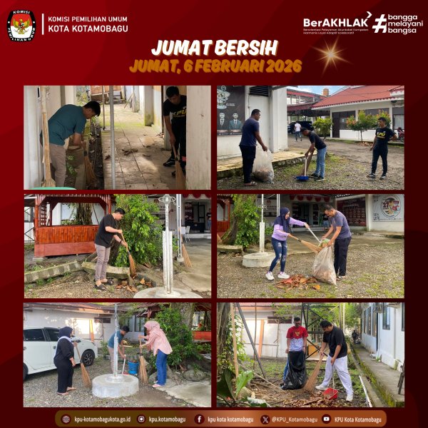 KPU KOTAMOBAGU – Wujudkan Lingkungan yang asri, Komisi Pemilihan Umum (KPU) Kota Kotamobagu melaksanakan kegiatan kerja bakti di lingkungan kantor, pada Jumat, 6 Februari 2026. Kegiatan tersebut melibatkan seluruh jajaran komisioner bersama sekretariat. Kerja bakti ini dilakukan sebagai bagian dari upaya menjaga kebersihan serta meningkatkan kenyamanan lingkungan kerja, sekaligus memperkuat semangat kebersamaan di antara seluruh pegawai KPU. Kepala Subbagian Partisipasi, Hubungan Masyarakat, dan Sumber Daya Manusia KPU Kotamobagu, Yessi Z.S. Mentang, menyampaikan bahwa kegiatan tersebut merupakan bentuk kepedulian dan komitmen bersama dalam menciptakan lingkungan kerja yang asri dan mendukung pelaksanaan tugas-tugas kelembagaan. “Lingkungan kerja yang bersih dan tertata dengan baik akan memberikan dampak positif terhadap semangat dan produktivitas kerja. Melalui kerja bakti ini, kami ingin menumbuhkan rasa tanggung jawab bersama serta mempererat kebersamaan antarpegawai,” ungkap Yessi. Diharapkan kegiatan ini dapat menjadi budaya kerja, sehingga mampu menciptakan suasana kerja yang kondusif dan menunjang peningkatan kualitas pelayanan KPU kepada masyarakat. Penulis: Parhubmas dan SDM / Amar