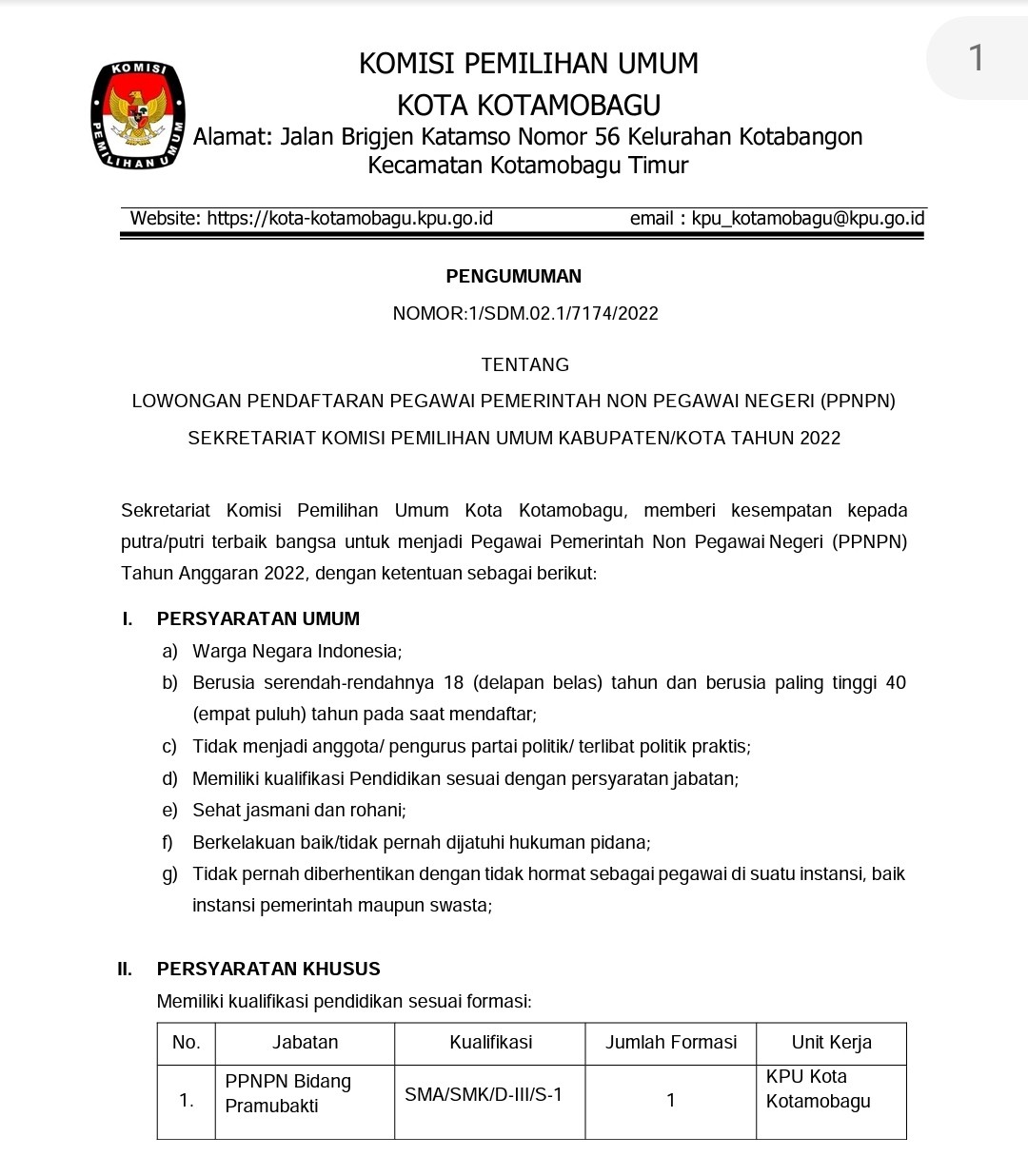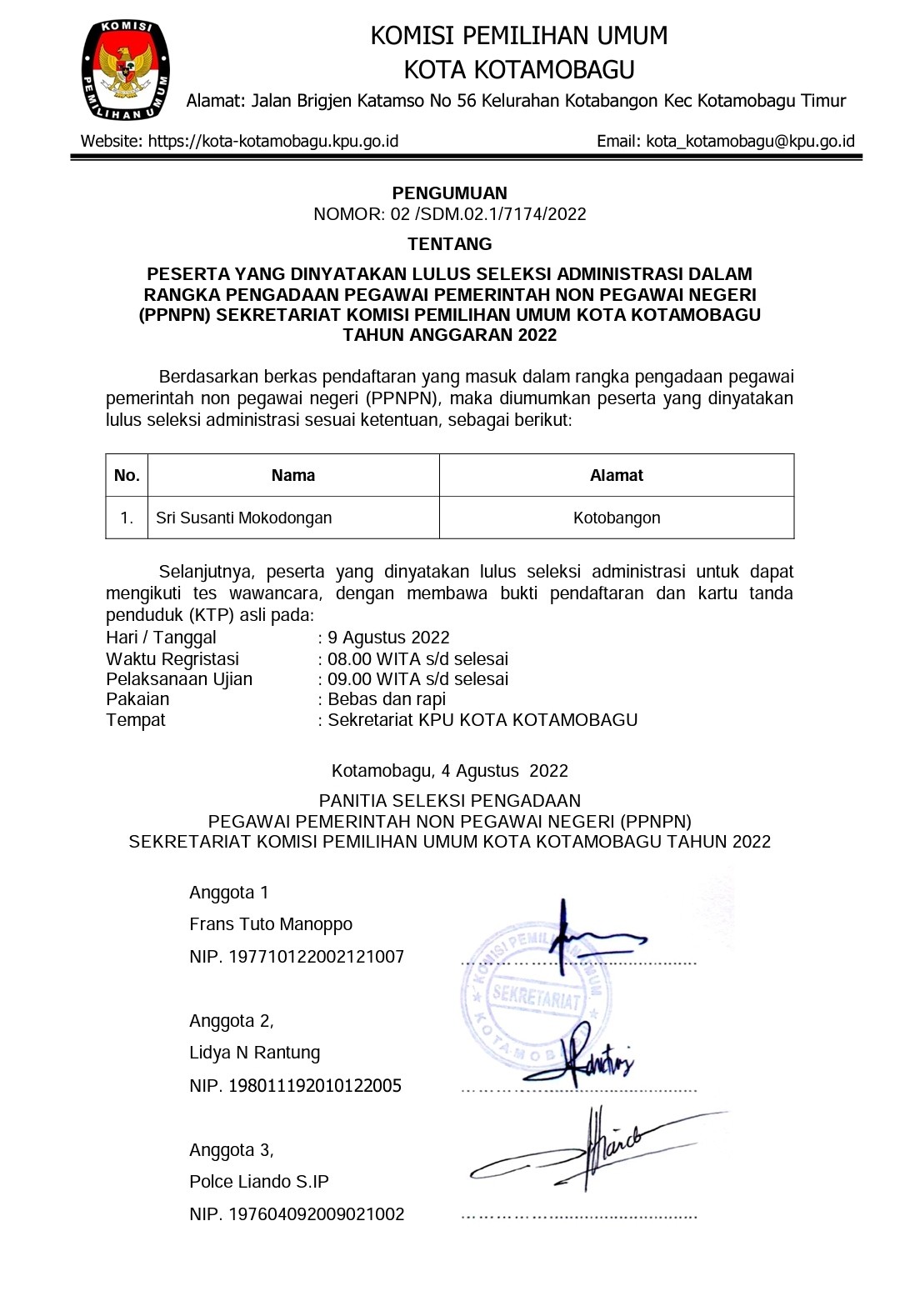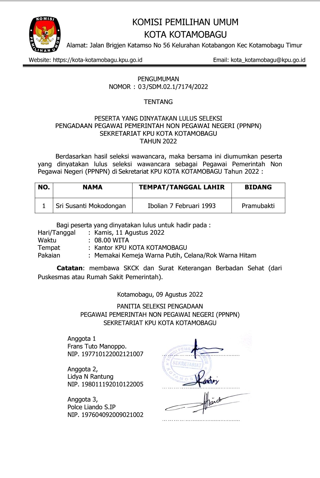 Berdasarkan hasil seleksi wawancara, maka bersama ini diumumkan peserta yang dinyatakan lulus seleksi wawancara sebagai Pegawai Pemerintah Non Pegawai Negeri (PPNPN) di Sekretariat KPU KOTA KOTAMOBAGU Tahun 2022
