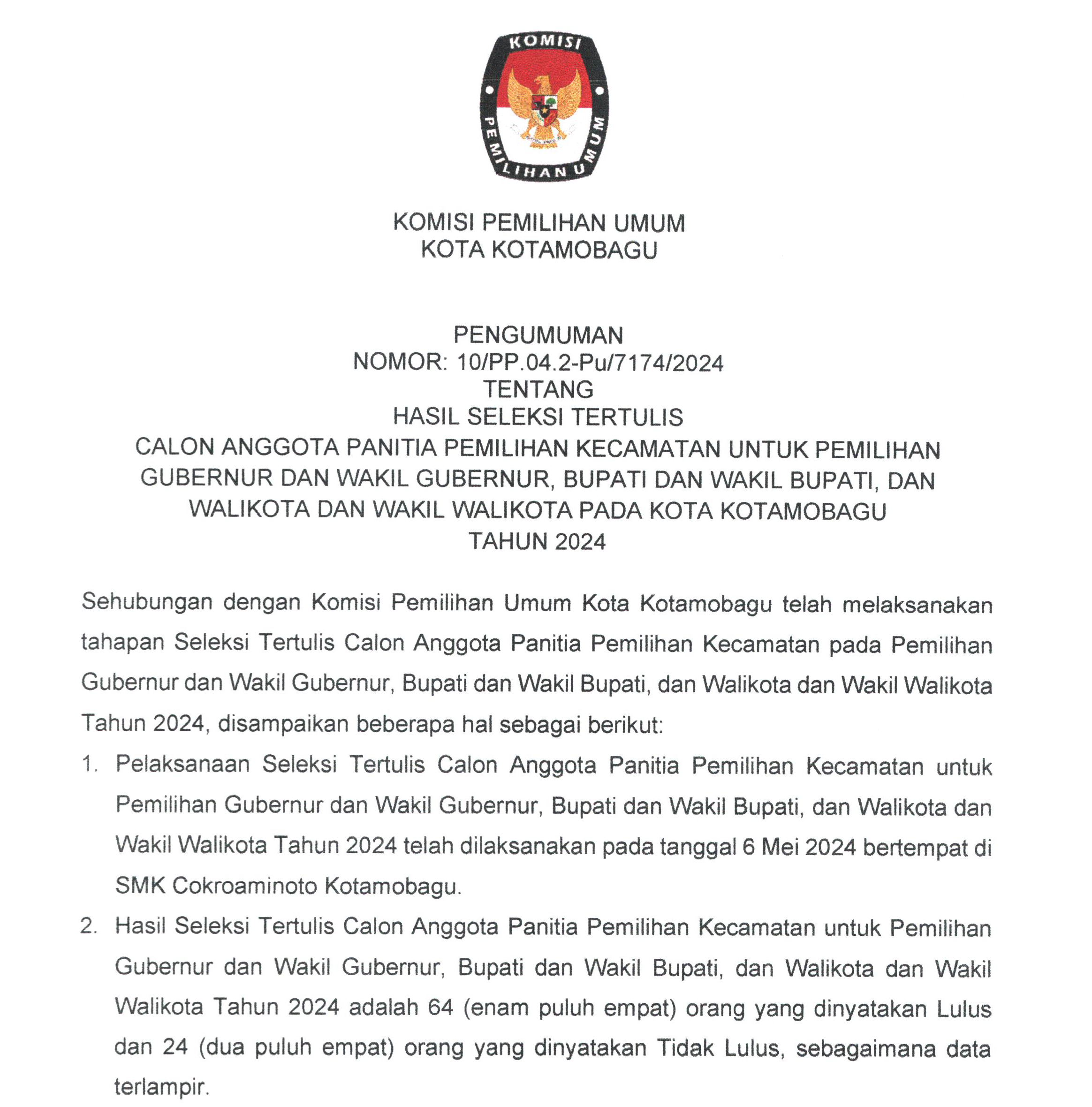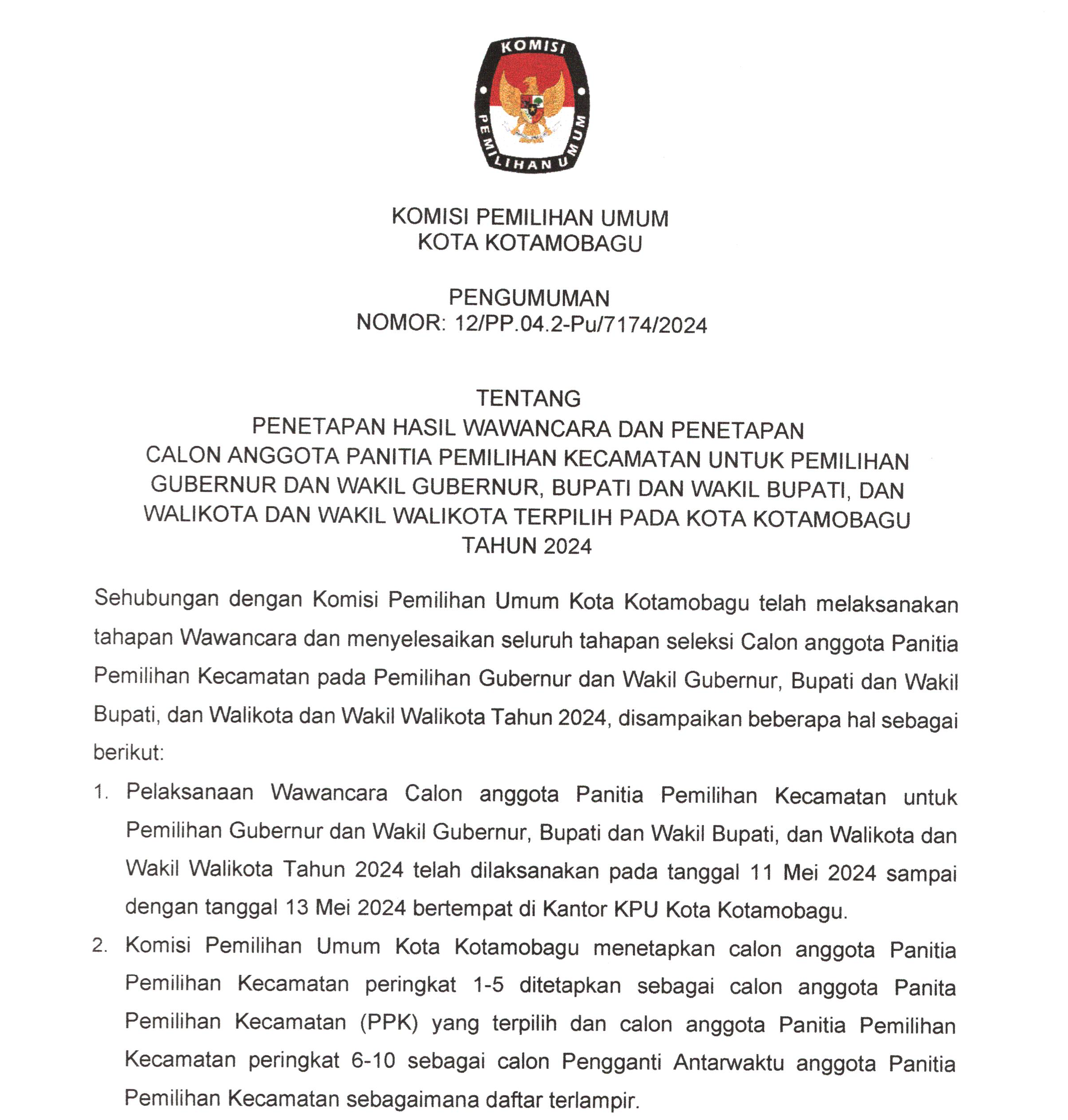 Keputusan Komisi Pemilihan Umum Kota Kotamobagu Nomor 155 tentang Penetapan Calon Terpilih Anggota DPRD Kota Kotamobagu dalam Pemilihan Umum Tahun 2024, selengkapnya KLIK DISINI