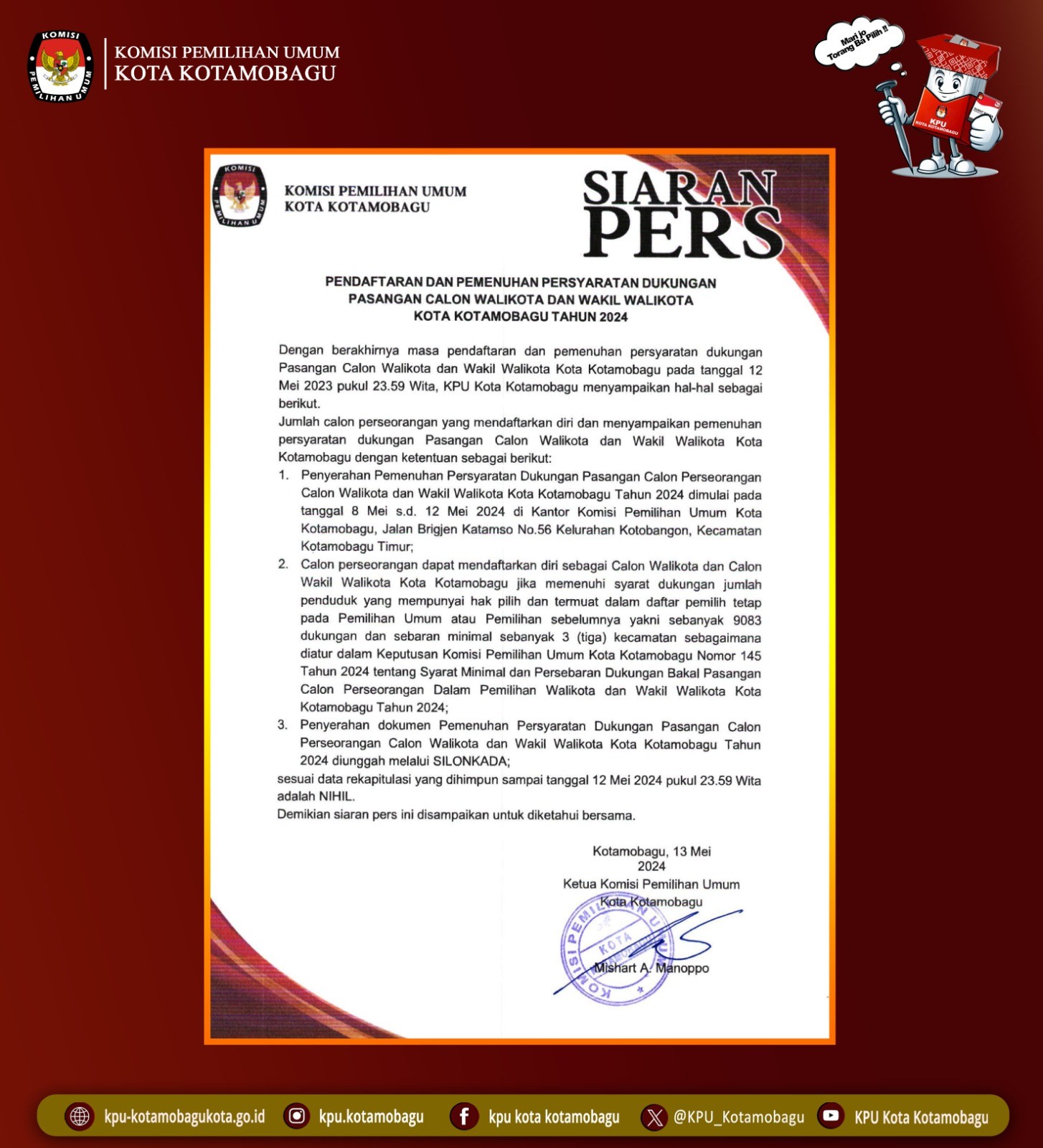 Keputusan Komisi Pemilihan Umum Kota Kotamobagu Nomor 154 Tahun 2024 tentang Penetapan Perolehan Kursi Partai Politik Peserta Pemilihan Umum Anggota DPRD Kota Kotamobagu dalam Pemilihan Umum Tahun 2024, selengkapnya KLIK DISINI